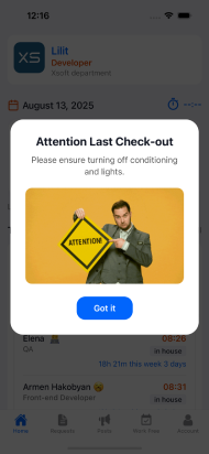 The system automatically checked the user out after reaching the configured maximum work hours. Helps prevent forgotten check-outs and ensures accurate tracking.
