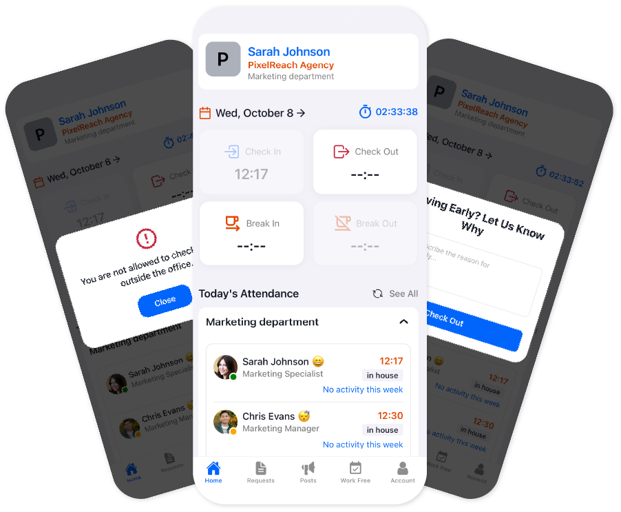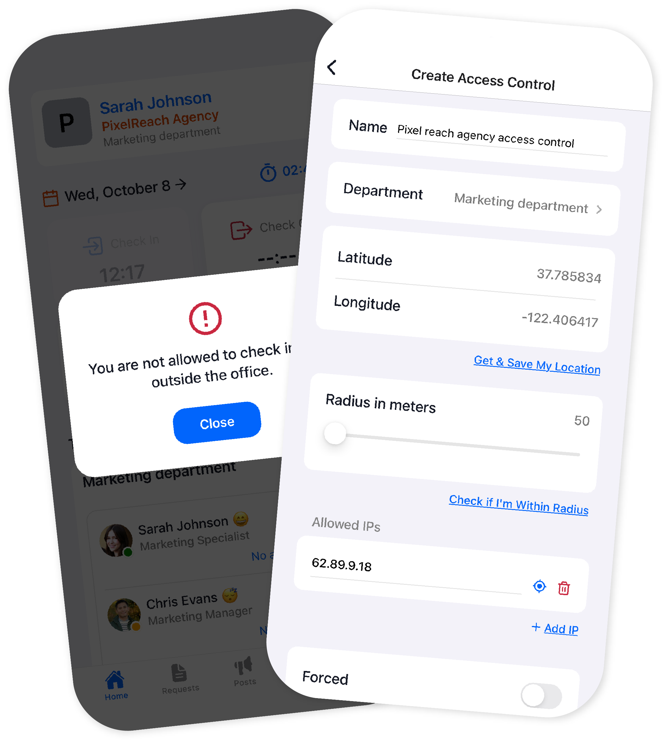 Every check-in is verified through smart logic. ShiftFox can restrict access to your office Wi-Fi, detect fake GPS signals, and log the exact location and device used.