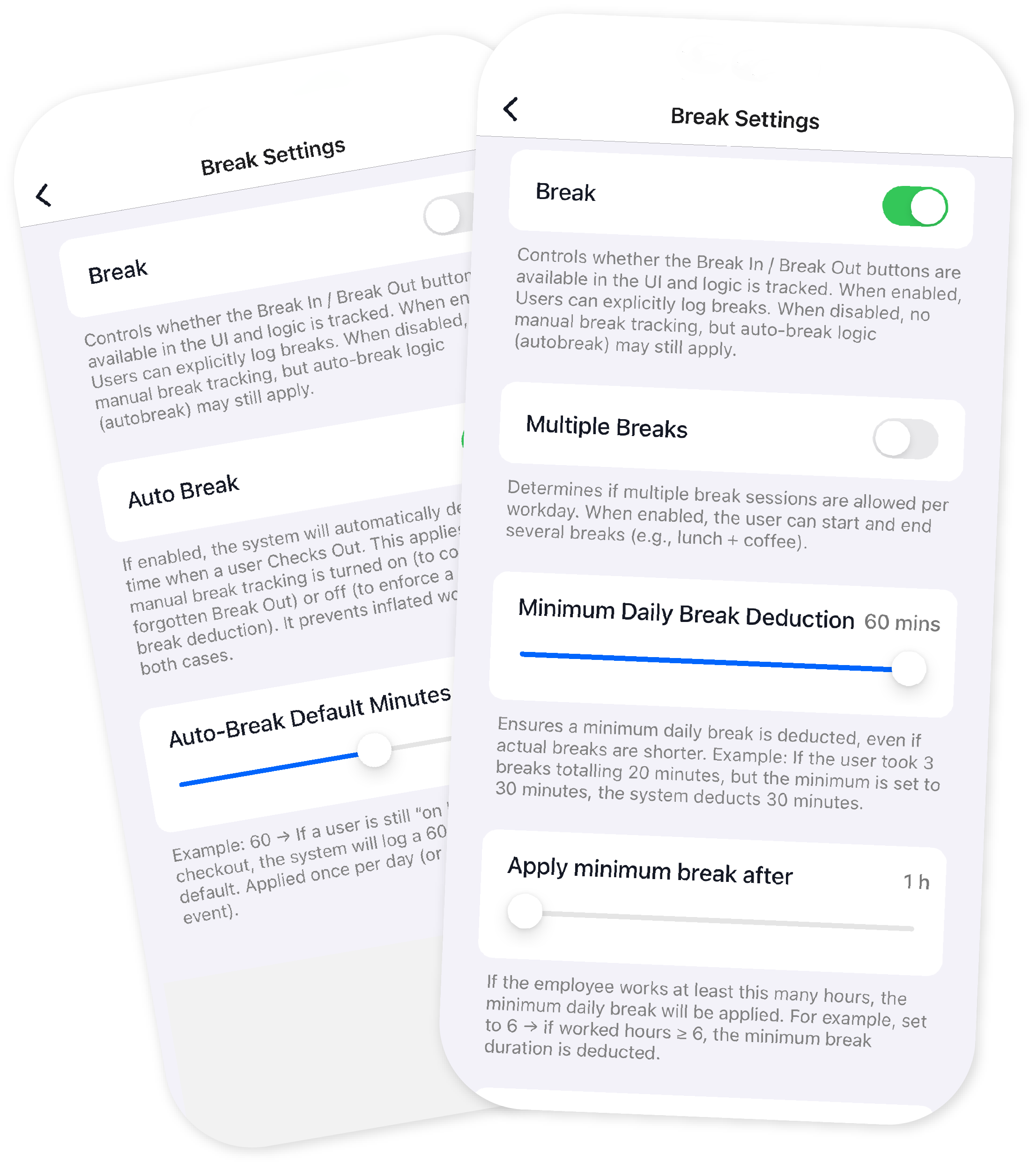 ShiftFox automatically records breaks and calculates total work duration. You can configure auto-break rules, minimum hours per shift, or flexible weekly goals.