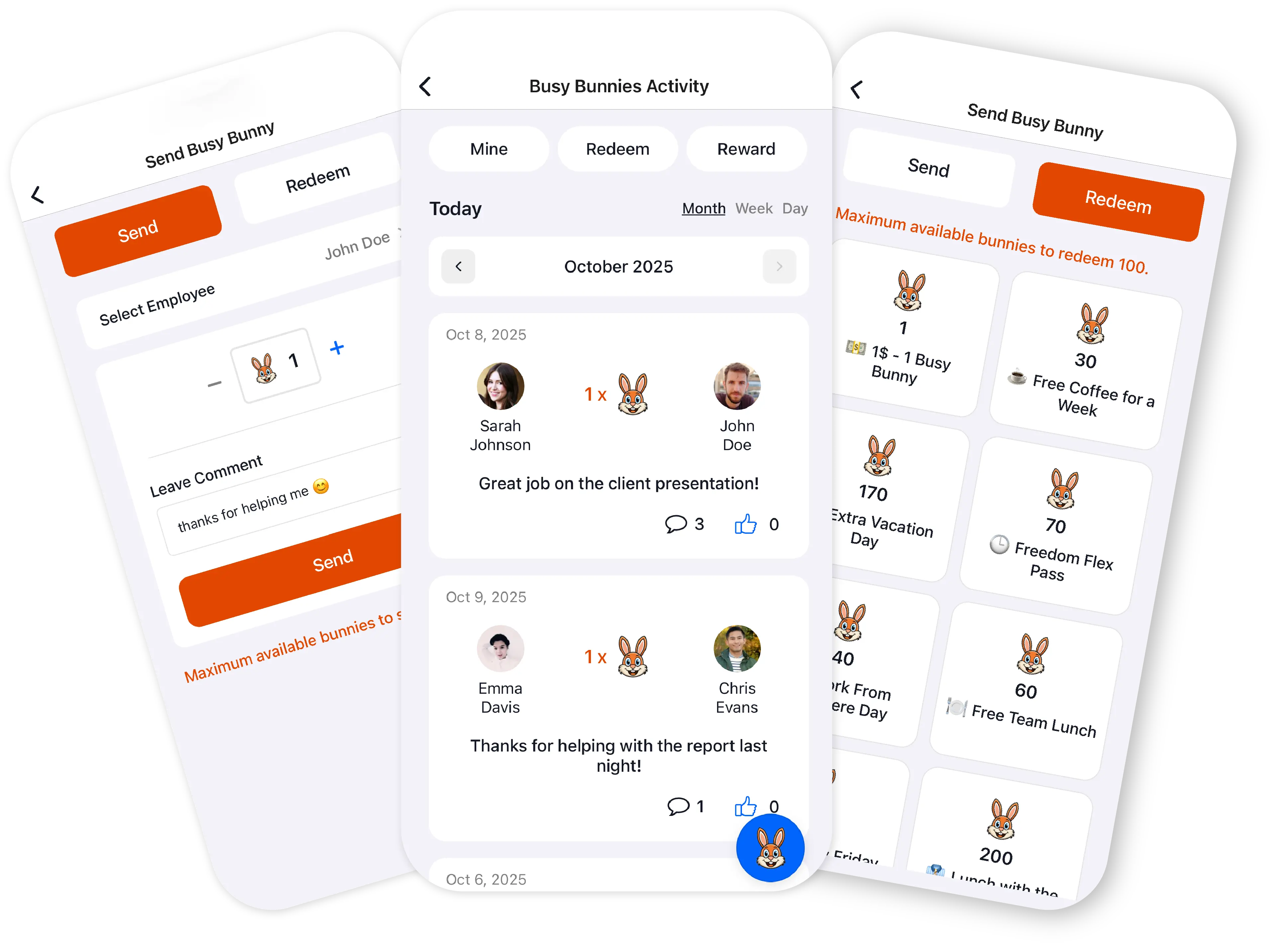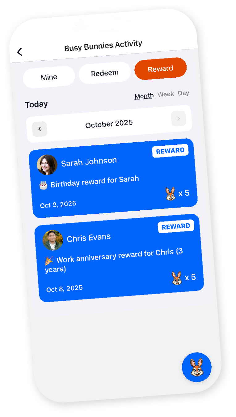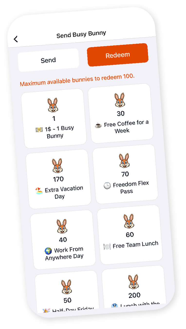 Each organization defines its own reward catalog — from coffee cards to day-off perks. Employees can redeem Busy Bunnies to unlock these benefits.