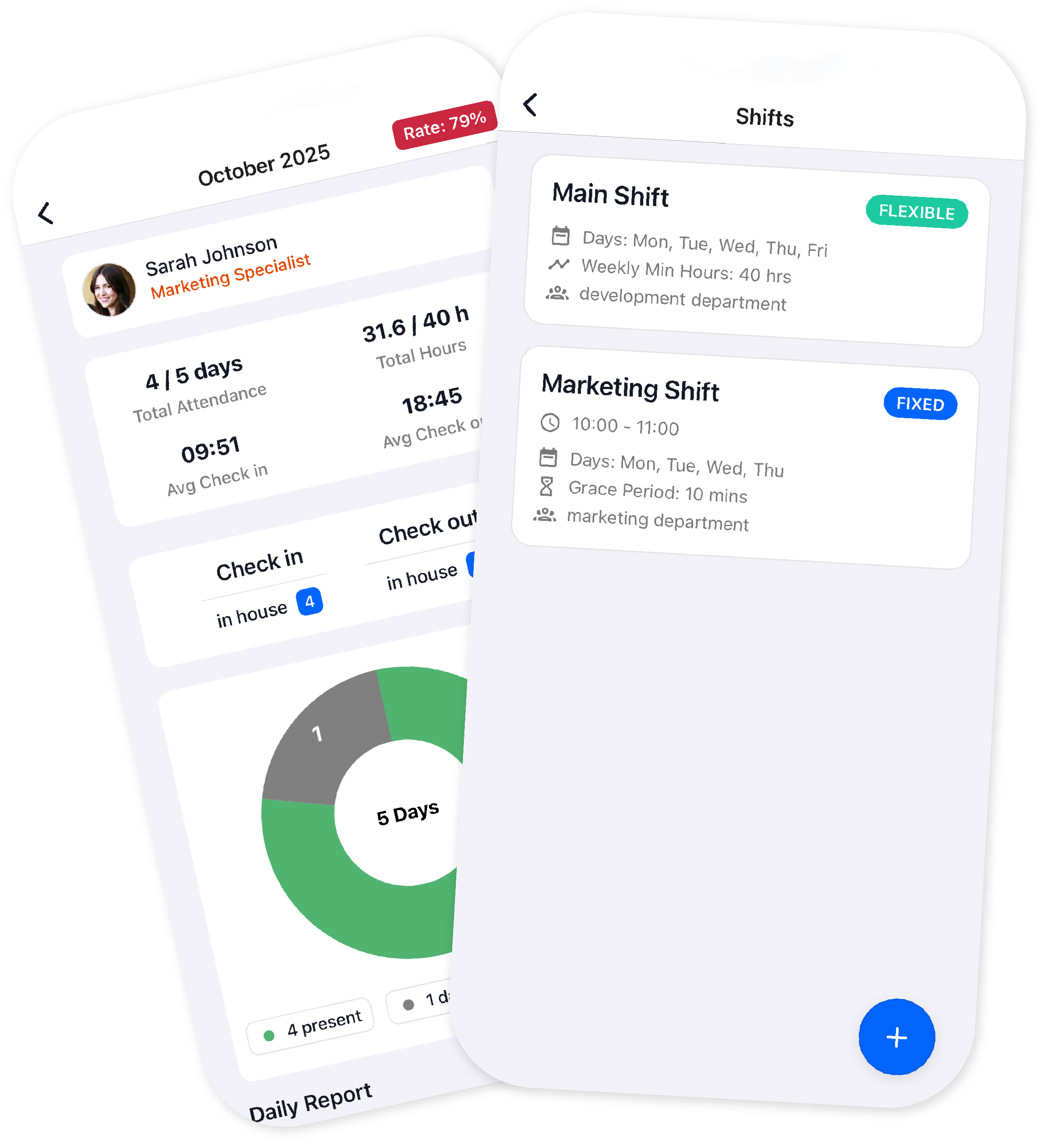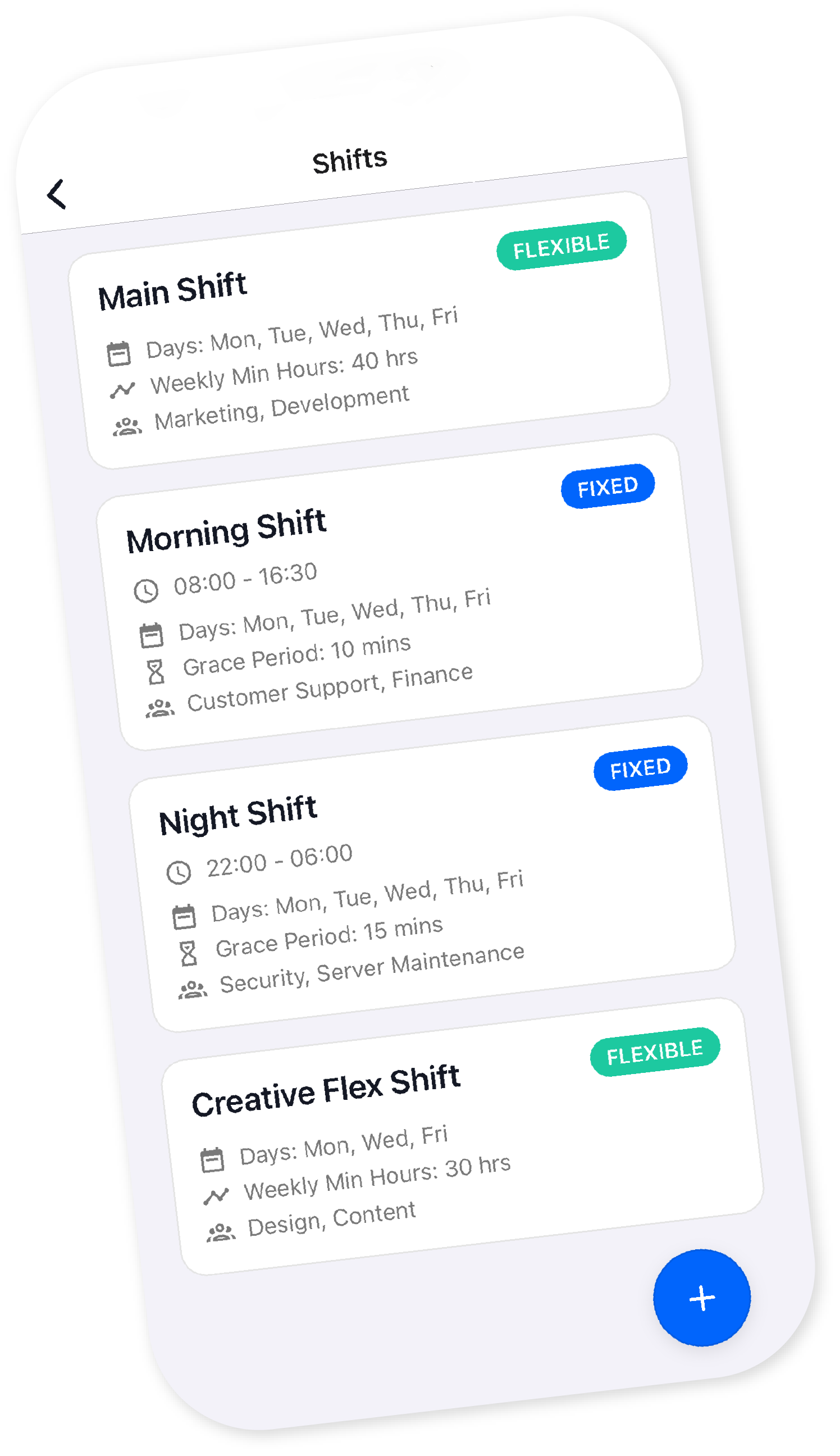 Ideal for retail, manufacturing, or office teams with defined start and end times. Set grace periods, breaks, and lateness rules automatically.