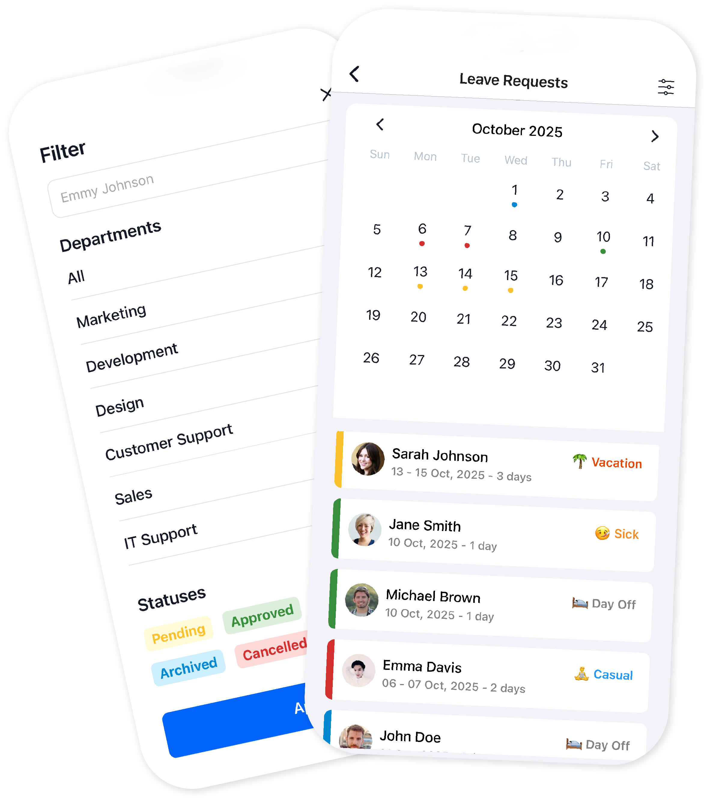 Approved vacations and sick leaves automatically appear in attendance summaries — no manual edits required. Reports always stay accurate.